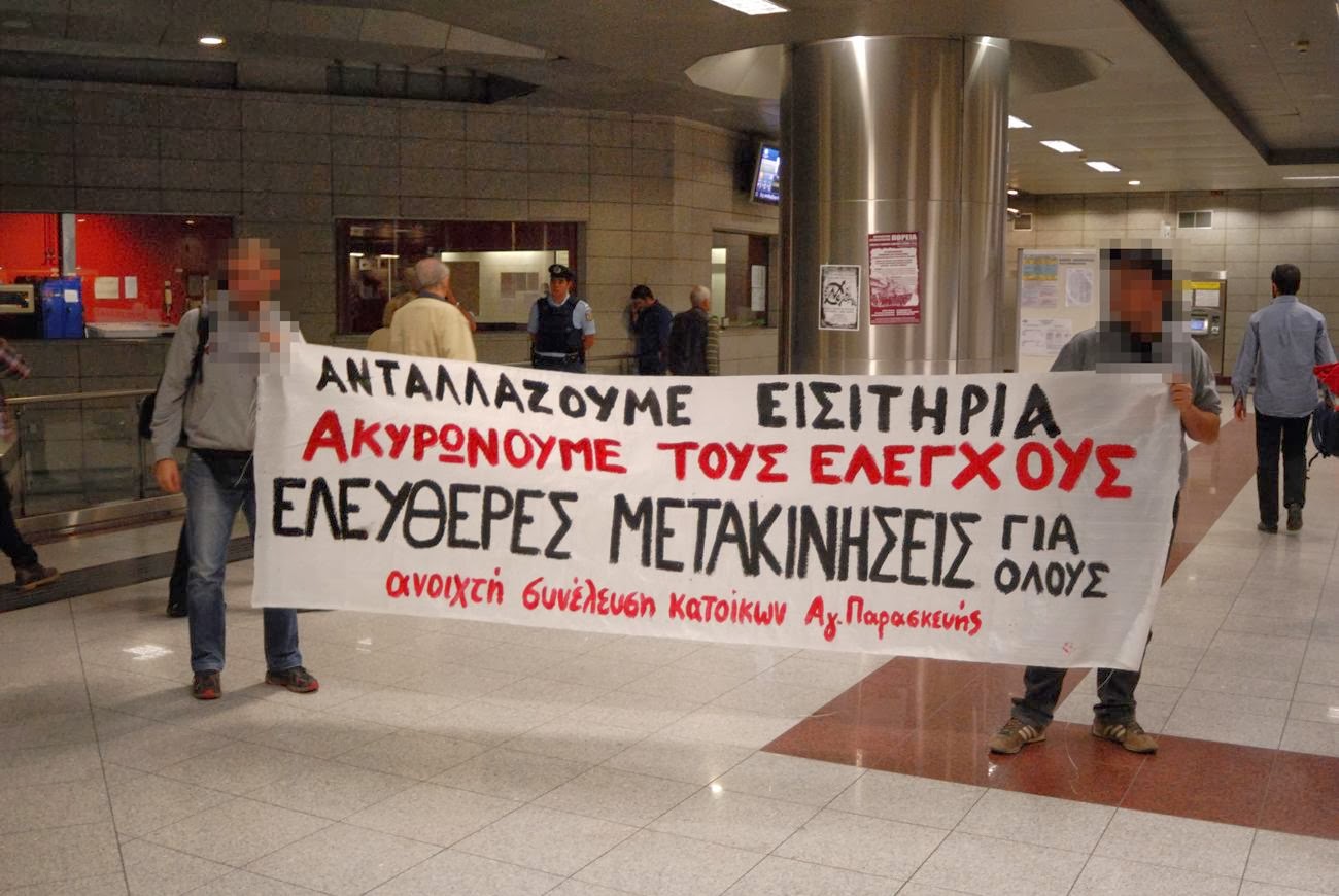 Tην Παρασκευή 18/10 η Ανοιχτή συνέλευση κατοίκων Αγίας Παρασκευής, μαζί με συνελεύσεις κατοίκων από διάφορες γειτονιές της Αθήνας που συμμετέχουμε στο συντονιστικό των συνελεύσεων γειτονιών (Ανοιχτή λαϊκή συνέλευση Περιστερίου, Συνέλευση πλατείας Βικτωρίας, Συνέλευση αντίστασης κι αλληλεγγύης Κυψέλης/Πατησίων, Συνέλευση Κατειλημμένων Προσφυγικών) προβήκαμε στην πρώτη από μια σειρά προγραμματισμένων δράσεων-παρεμβάσεων για τα μέσα μαζικής μετακίνησης. Η συγκεκριμένη παρέμβαση πραγματοποιήθηκε στο σταθμό μετρό Δ. Πλακεντίας. Στο πλευρό μας στάθηκαν αλληλέγγυοι/ες από τις γύρω περιοχές και από εργατικά σωματεία.